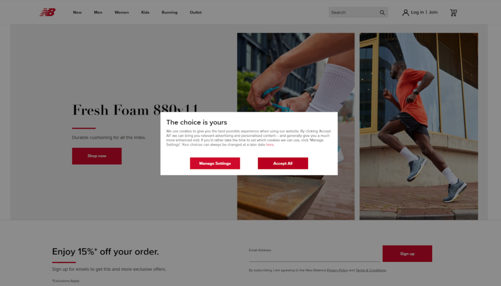 We praised CookieYes for displaying a visible, but not invasive, cookie banner. So, when looking at New Balance’s center-stage modal pop-up banner, you may not immediately realize why we chose it.